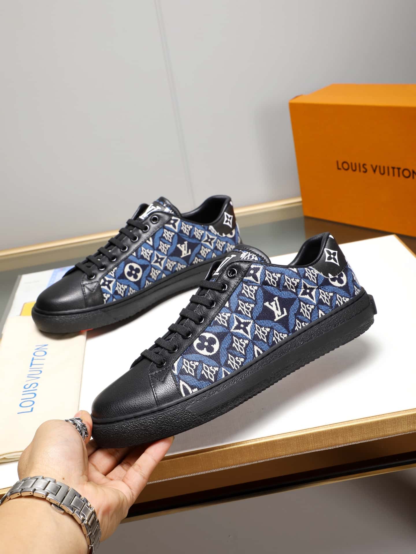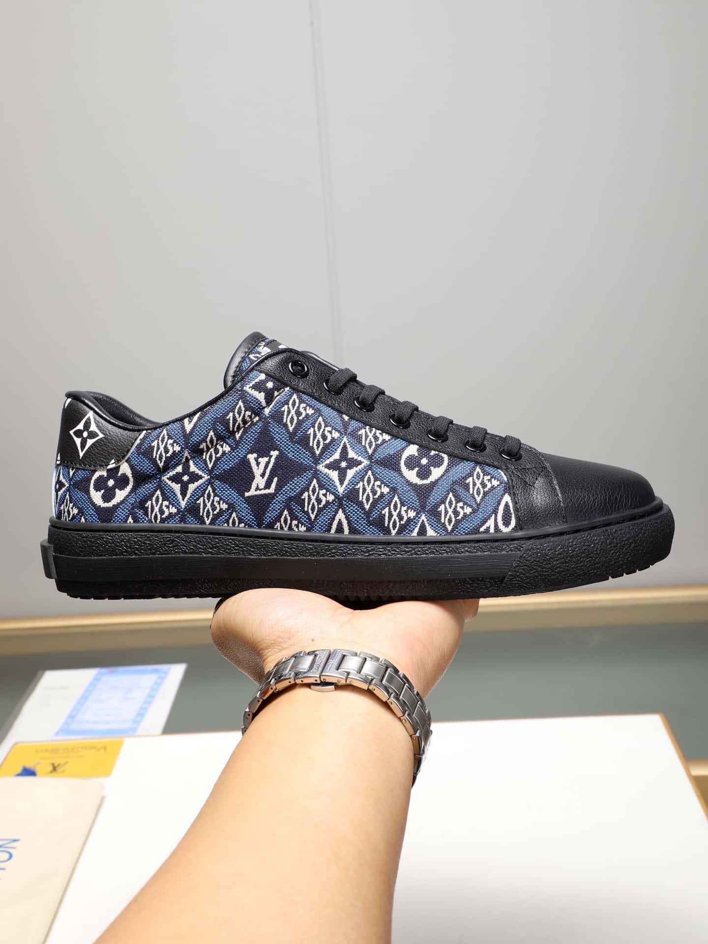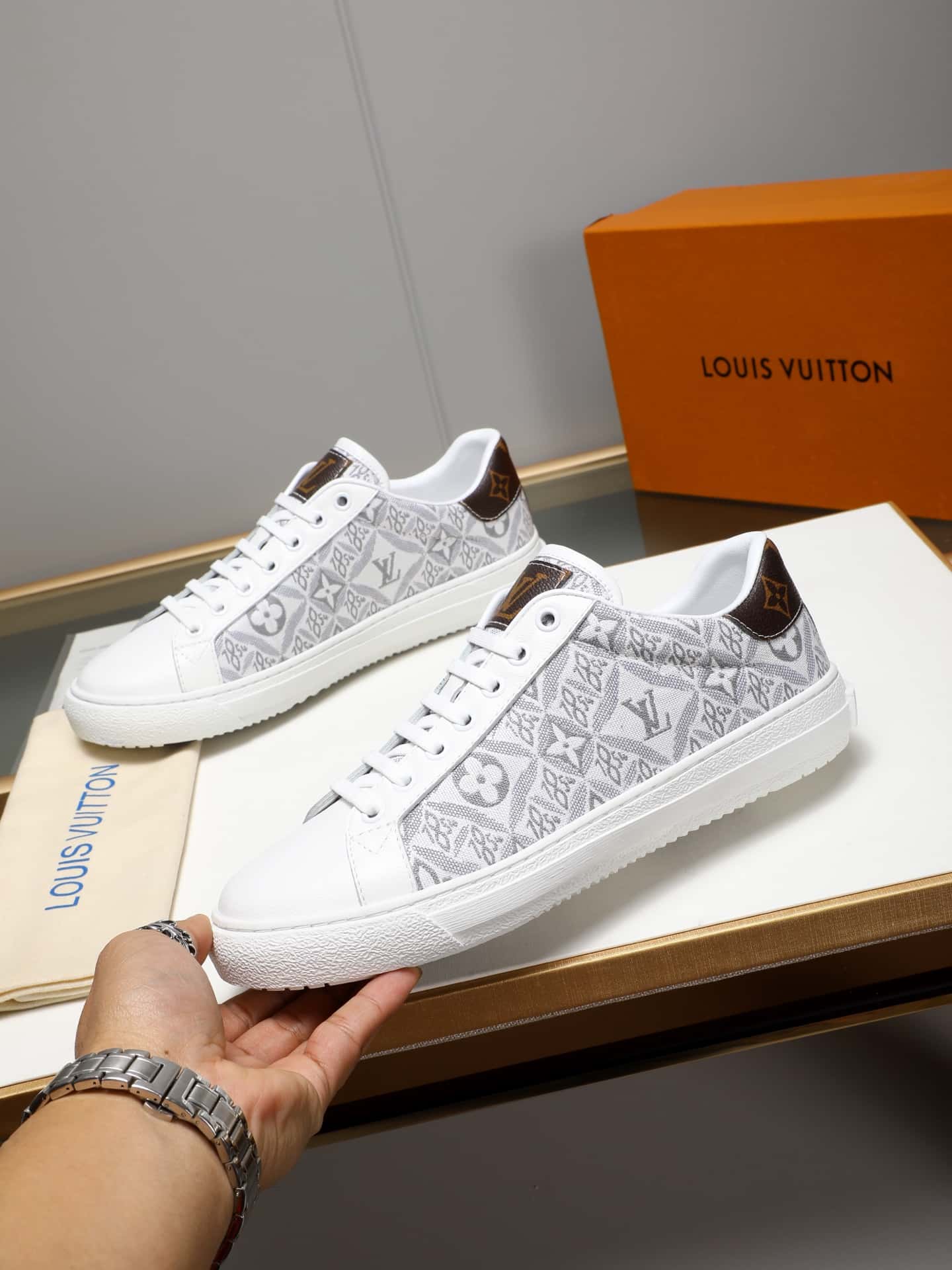 モノグラム パターンと精巧な LV モノグラムが施された滑らかなカーフスキンで作られたこの LV トレーナー スニーカーは、ヴァージル アブローがデザインし、ビンテージのバスケットボール シューズからインスピレーションを得たオリジナルのシルエットで作られています。