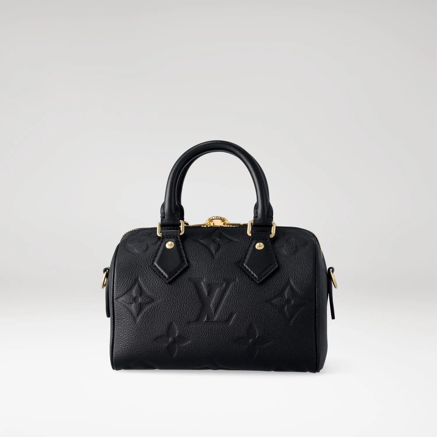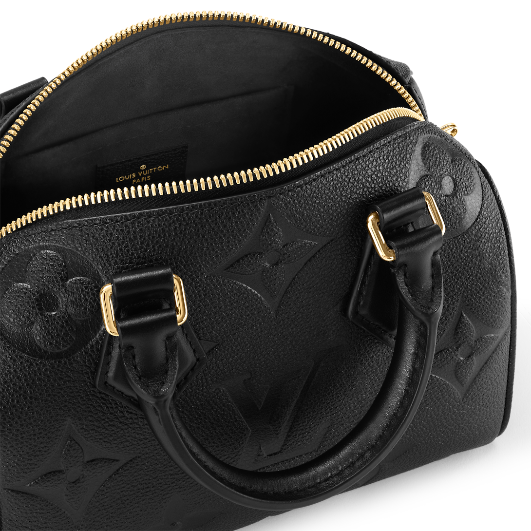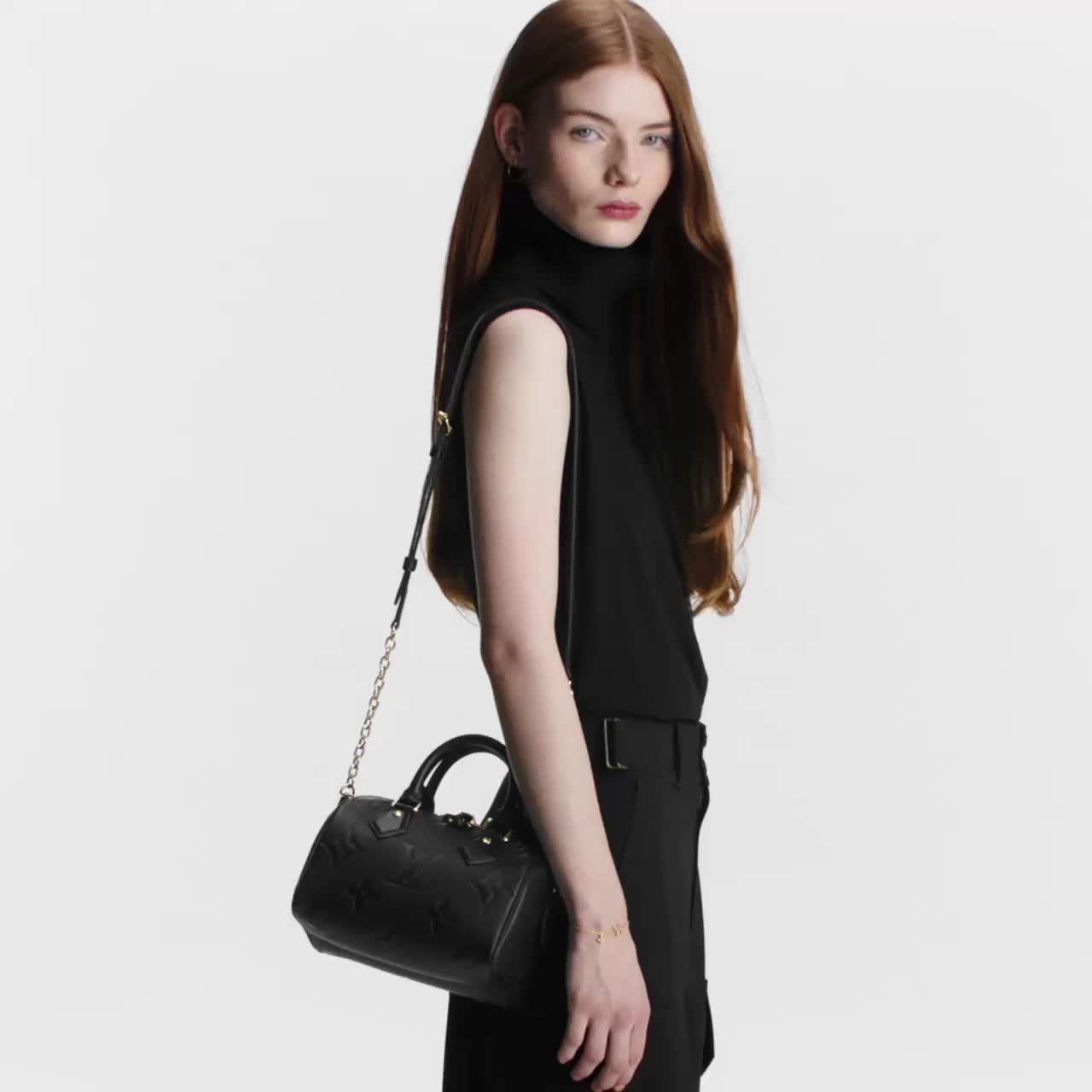 必需品を持ち運ぶのに最適なコンパクトサイズのトレンディなハンドバッグ「スピーディ・バンドリエール 20」。モノグラム・ジャイアント パターンをエンボス加工で施した、なめらかなグレインが魅力のモノグラム・アンプラント レザーで仕立てました。ゴールドカラーのメタルパーツとパドロックが特徴です。2本のトロンハンドルに加え、取外し & 調節可能な繊細なチェーンストラップを備えています。